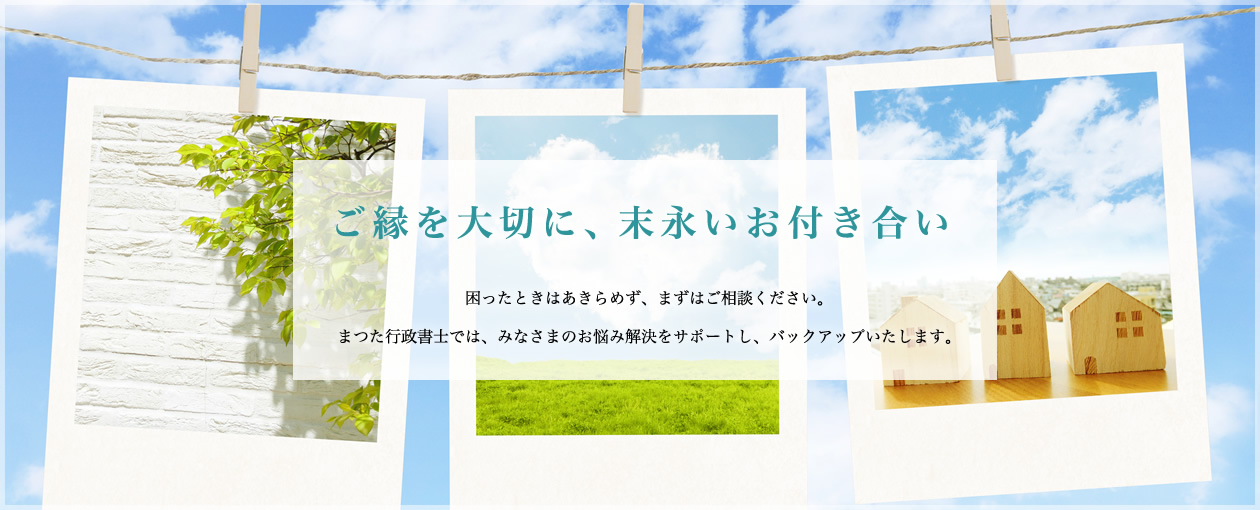 茨城県龍ヶ崎市にある「まつた行政書士事務所」は、許可・認可(許認可)申請書類作成、契約書の作成、会社設立のサポート、相続・遺言書の作成・サポートなどを行っております。
